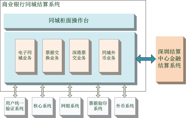 商业银行同城结算系统是深圳市内各商业银行为接入深圳同城金融结算系统而构建的一套全业务的商业银行同城支付系统,其融合了电子同城业务、票据交换业务、深港同城业务和同城外币业务等跨行支付业务。系统提供全套业务柜面操作台和自动化处理后台,与用户统一验证系统对接完成柜员身份验证;与核心系统对接完成行内账务处理;与网银系统对接实现网银业务提成;与票据验印系统对接实现对票据的在线验证,支持同城票据、深穗票据业务;与外币系统对接完成外币业务账务处理.